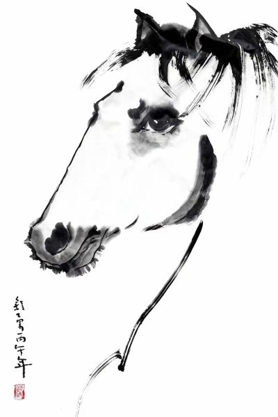 我不再满足于完整呈现骏马那矫健身姿,而是把情感与思考汇聚到马首,尤其是那两只深邃的眸子,这看似大胆的汇聚,事实上是跨媒介实践过后的必然抉择,雕塑的经验帮我在二维平面,利用墨色的浓淡变化塑造出有真实体量感的头颅结构,我笔下勾勒的线条,起承转合当中带有金石刀刻似的力度,不只是开展轮廓的勾勒,更是骨骼跟肌肉于空间里转折与力量相互交融,摄影对“关键时刻”的寻觅,令我在神态捕捉方面的要求极高,马匹那幽微、稍纵即失的凝视,要在精神张力攀升至顶点时“定格”在宣纸上,成为永恒。