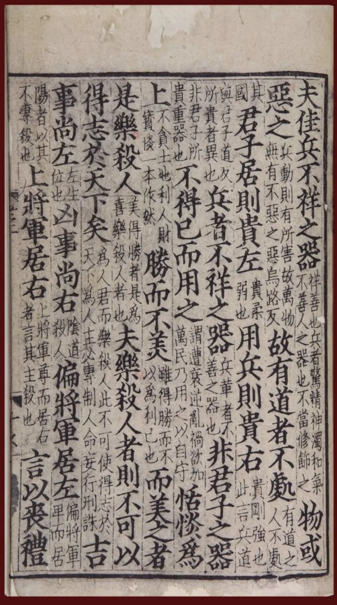 《道德经》:夫兵者不祥之器也,物或恶之?故有欲者弗居。君子居则贵左,用兵则贵右,故兵者非君子之器也。兵者不祥之器也,不得已而用之,铦袭为上,勿美也。若美之,是乐杀人也。夫乐杀人,不可以得志于天下矣!是以吉事上左,丧事上右。是以偏将军居左,上将军居右,言以丧礼居之也。杀人众,以悲哀莅之;战胜,以丧礼处之。