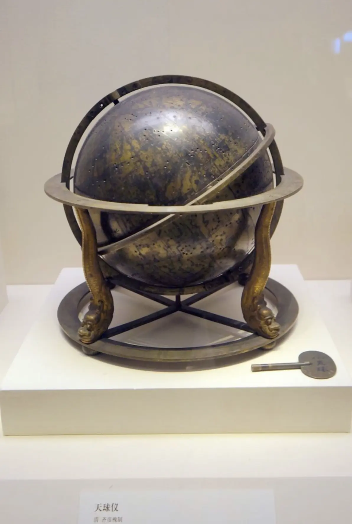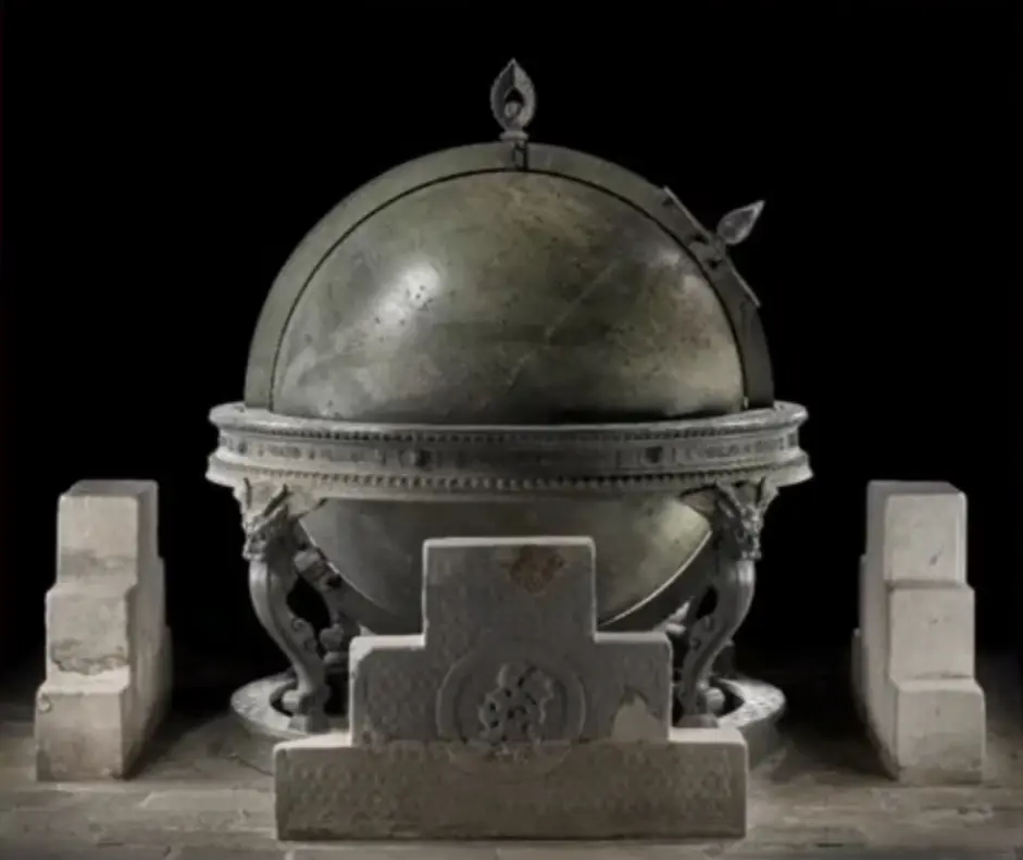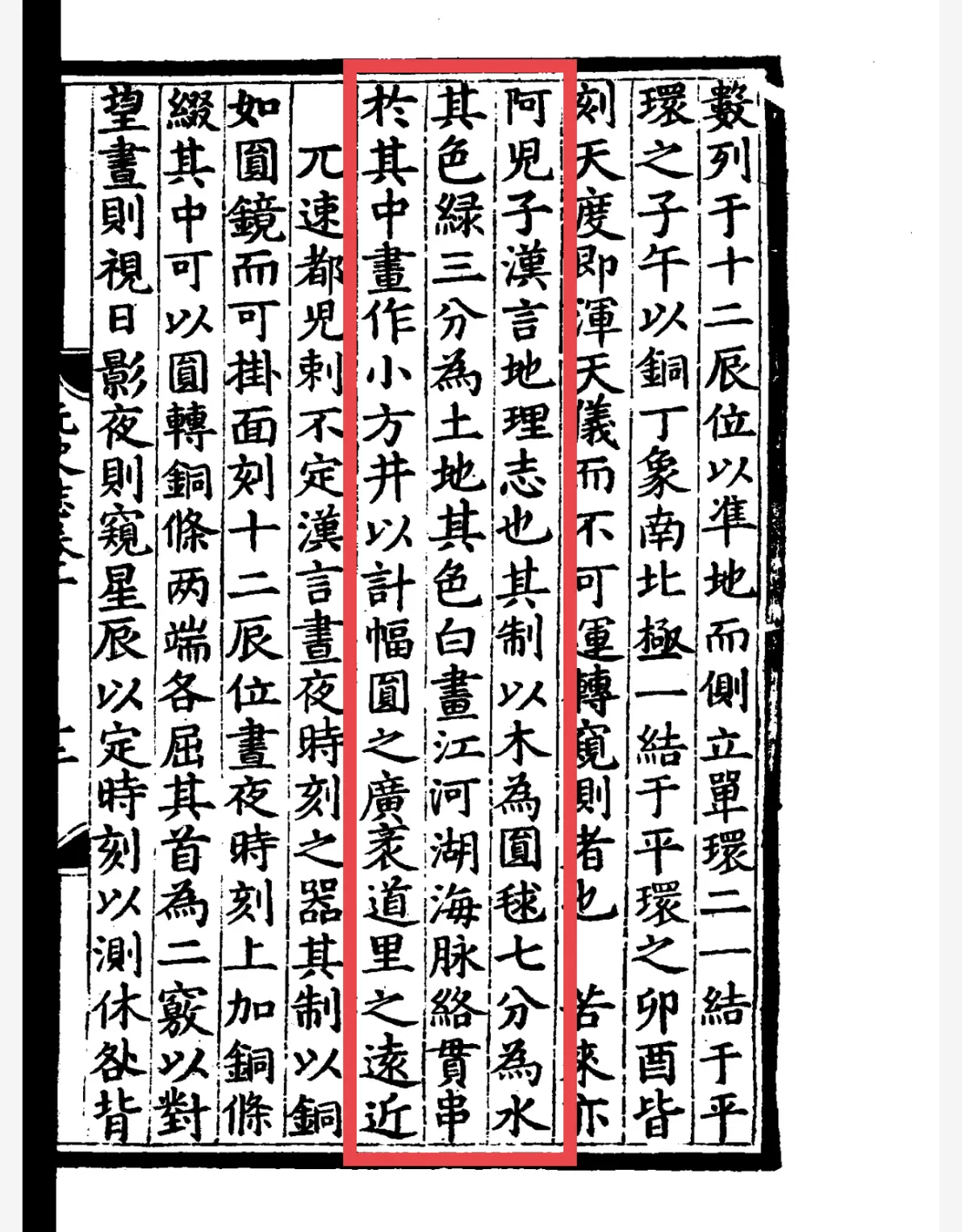 《元史·天文一》“其制以木为圆球,七分为水,其色绿,三分为土地,其色白。画江河湖海,脉络贯串于其中。画作小方井,以计幅圆之广袤、道里之远近。”这是元代地球仪。