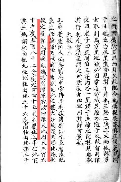 张衡《浑仪注》曰:浑天如鸡子,天体圆如弹丸,地如鸡子中黄,孤居于内。天大而地小,天表里有水。天之包地,犹壳之裹黄。天地各乘气而立,载水而浮。周天三百六十五度四分度之一;又中分之则一百八十二度八分之五覆地上,一百八十二度八分之五绕地下。故二十八宿,半见半隐,其两端谓之南北极。北极,乃天之中也。在正北,出地上三十六度,然则北极上规,径七十二度,常见不隐。南极,天之中也。在南,入地三十六度,南极下规七十二度,常伏不见。两极相去一百八十二度半强。天转如车毂之运也,周旋无端,其形浑浑,故曰浑天也。